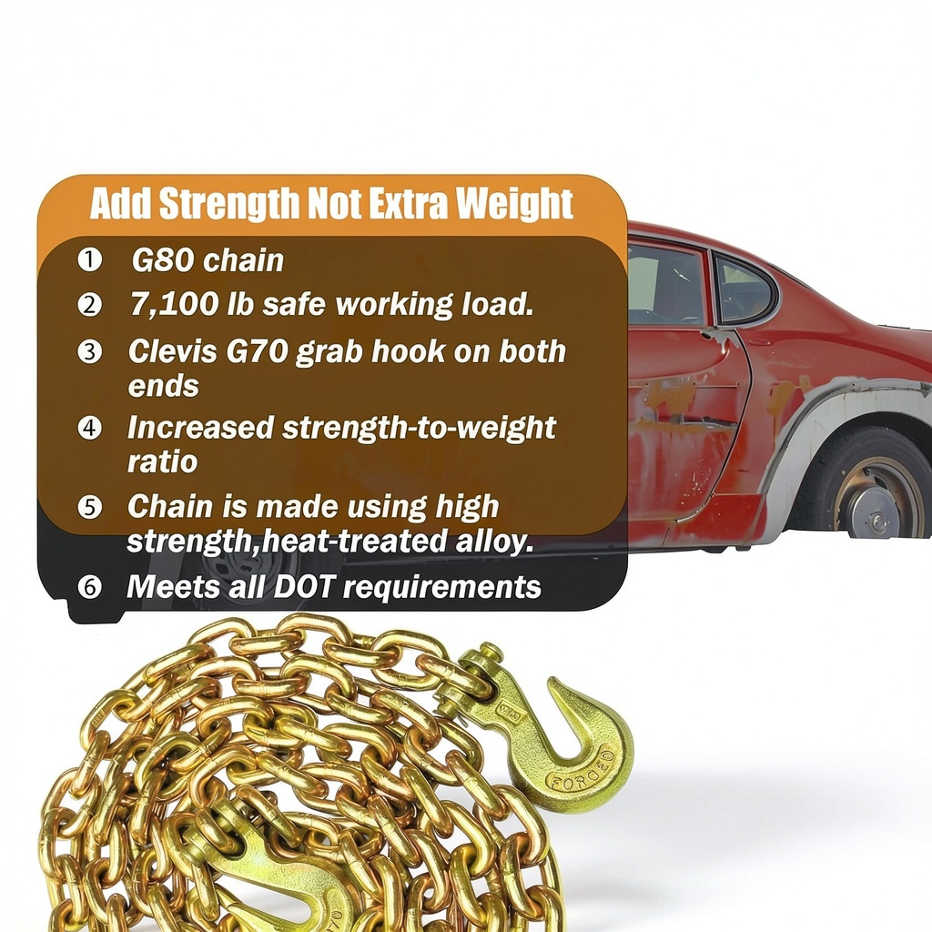 This transport chain is designed for securing heavy cargo on flatbeds, trailers, and during vehicle hauling, providing reliable tie-downs for construction, logistics, and agricultural industries. It’s suitable for professionals in transportation, warehousing, and towing who require compliant equipment for roadside inspections. Common scenarios include binding machinery, equipment, or large loads during transit, ensuring safety and stability in harsh environments.